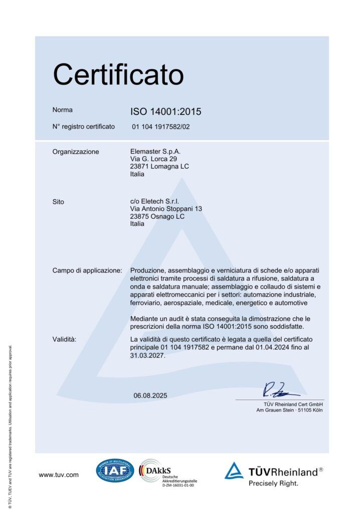 Environmental responsibility is an integral part of our quality culture and operational processes,” commented Sergio Sala, Corporate Quality & Process Manager of Elemaster Group. “The renewal of ISO 14001:2015 for both Eletech and Elemaster Prototypes highlights our commitment to maintaining high sustainability standards across all strategic areas of the Group, from R&D and prototyping to industrialisation.”